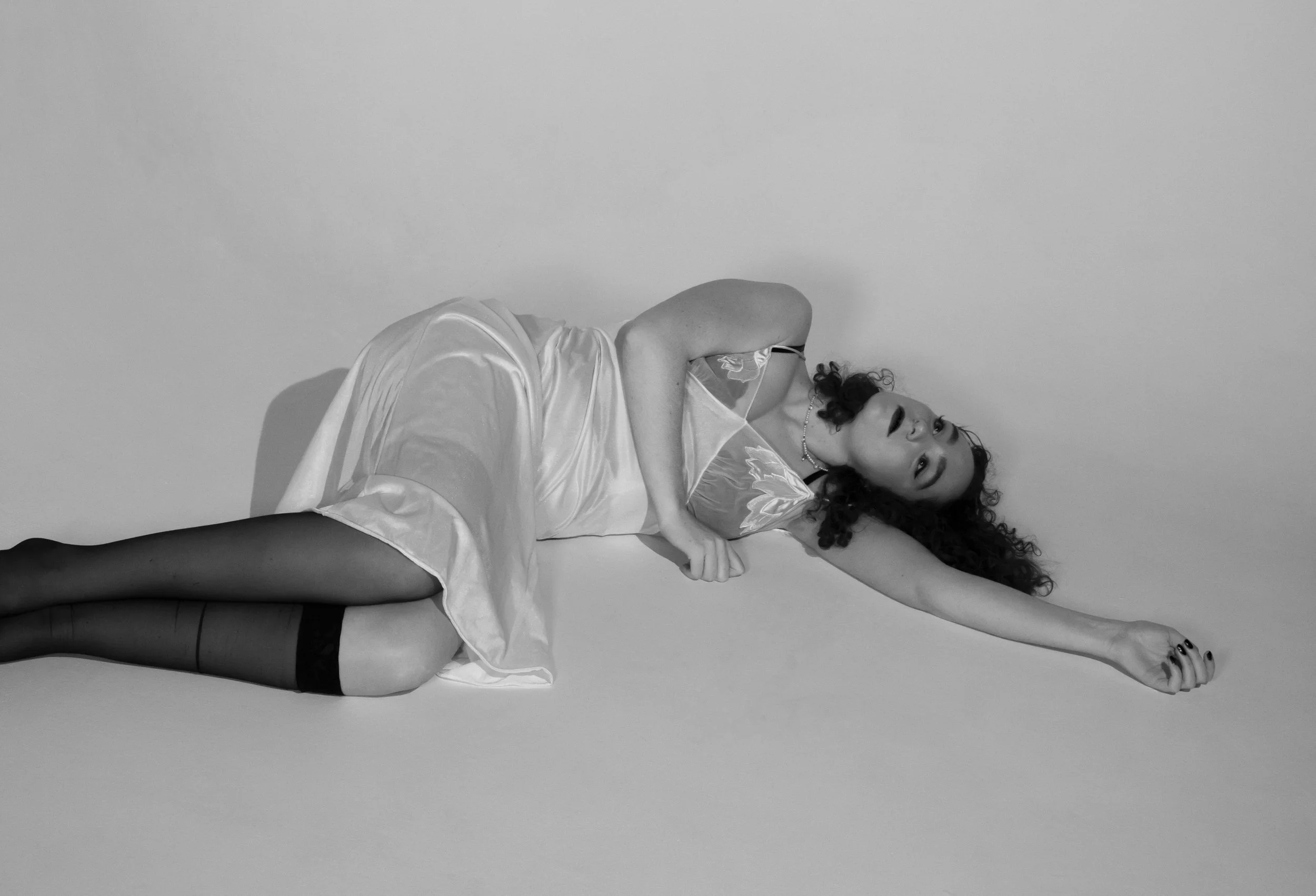This work, “Love Letters” mixes my interest in vintage fashion, Victorian portrait photography and mid-century pinups. Self-portraiture gives me a way to explore how my body appears in photographs, grappling with my own self-esteem issues while allowing her full freedom to enact vulnerable poses seen in historic photographs. The black and white colouring of the photos is meant to evoke the silvery shine of Victorian daguerreotypes, the silver screen, and the mid-century magazine prints of pinup models.